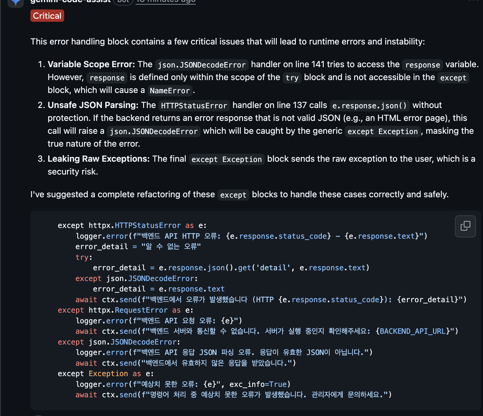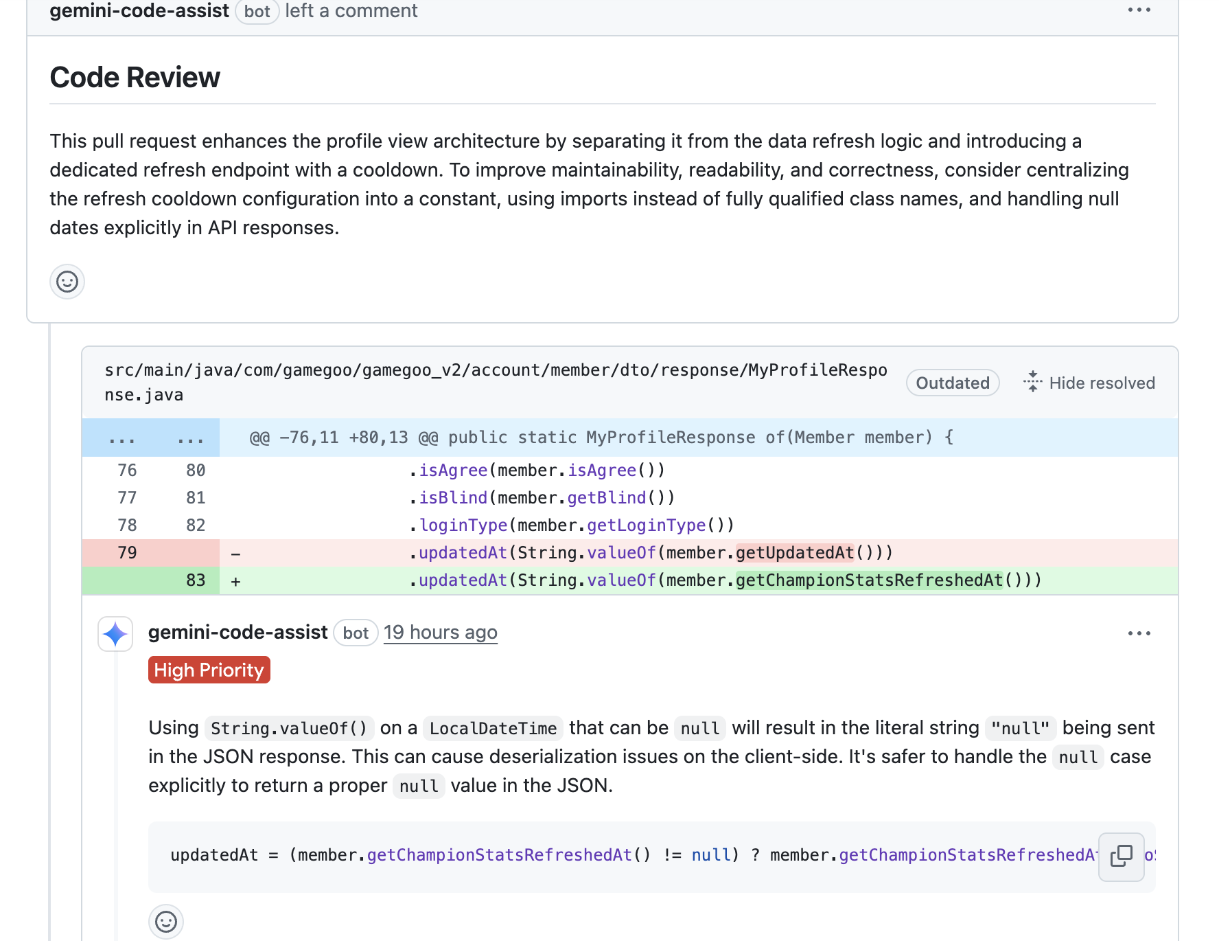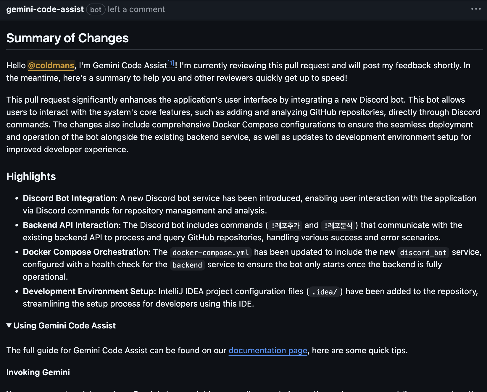 뭔가 최종의 최종 검수를 받고 싶을 때가 종종 있는데 이러한 가려움을 해결해 준게 gemini 코드 리뷰 봇이다...!