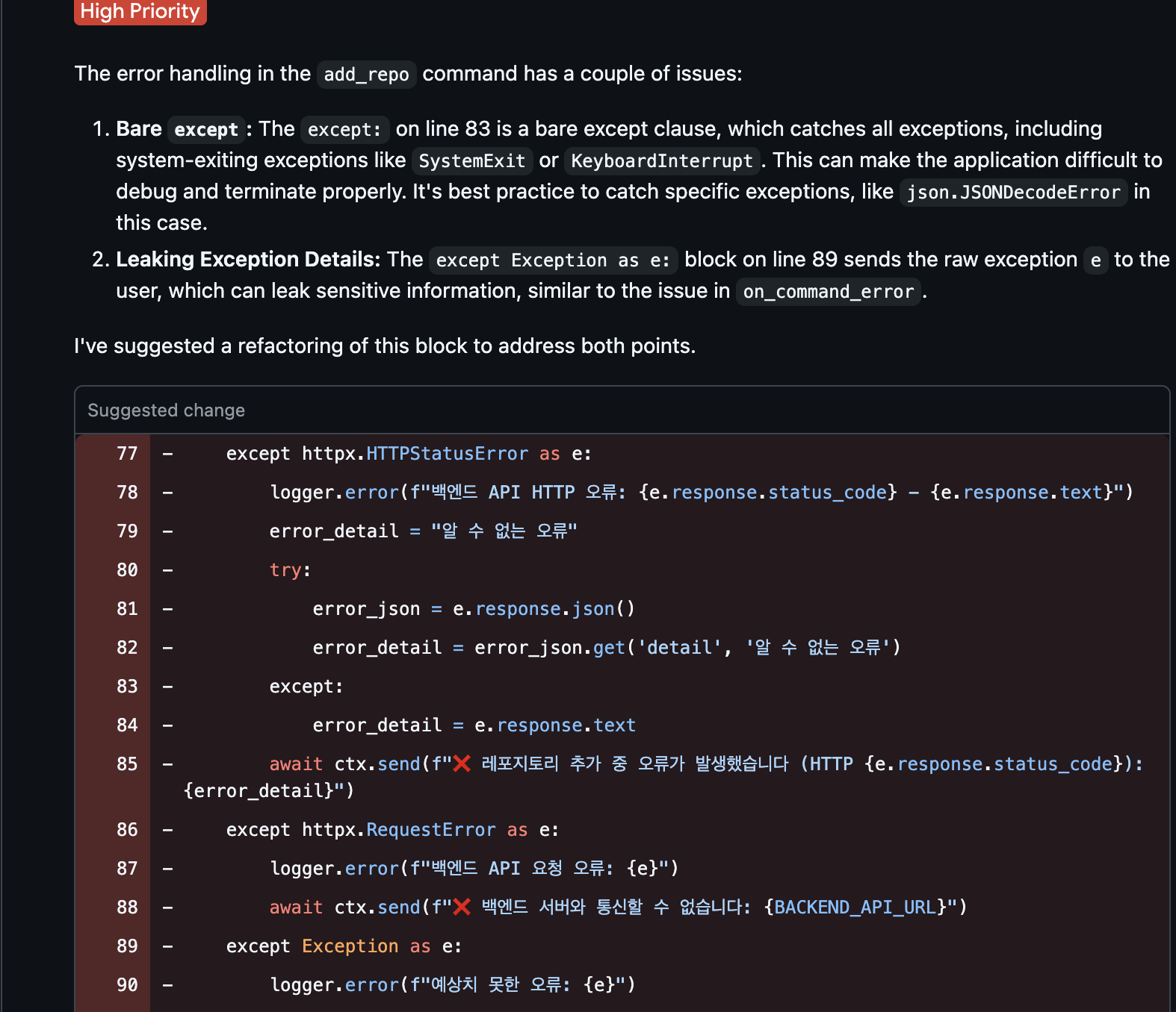 난 현재 mcp를 직접 만들어서 깃허브 레포지토리를 디스코드에서 좀 더 디테일하게 들여다볼 수 있는 봇을 만들고 있는데 이 코드에 대한 리뷰를 맡겨볼 생각이다.